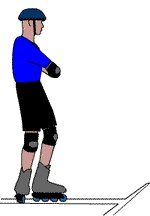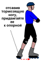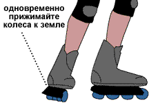 Одновременно прижимайте колеса к земле. Следите за тем, чтобы все колеса роликового конька тормозящей ноги одновременно прижимались к земле, т.е. тормозящую ногу не следует поднимать на носок или отрывать пятку от земли, это может привести к немедленному развороту. |