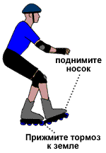 | Только после того, как научитесь уверенно выводить тормозящую ногу вперед, плавно поднимайте носок тормозящей ноги и прижимайте тормоз к земле. |