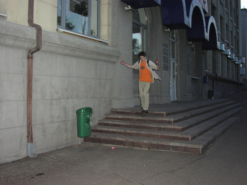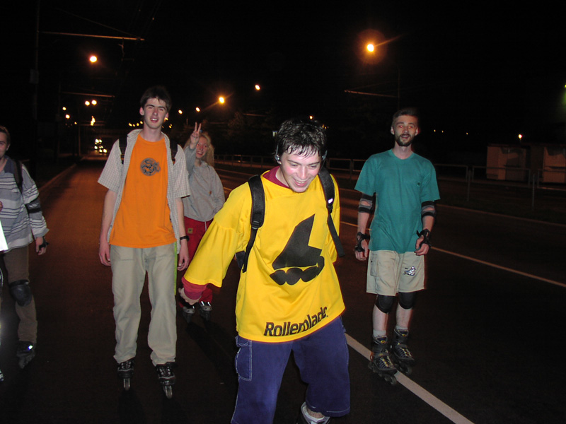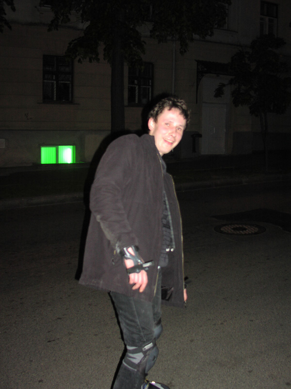 «Легенда русского рока...». Не того рока о котором вы подумали, да и не в этом суть. После бурно отпразднованного Дня рождения, с веселящими молекулами в крови самое милое дело - проехать на роликах до дома. И несмотря на то, что говорят, будто бы алкоголь и восемь колёс несовместимы, Дима с невозмутимым видом потрясающе уверенно стоял на коньках. Движение получалось, правда, похуже, падал иногда, через два метра, но с кем не бывает. Очень скоро он оторвётся от всей группы даже не заметив, все за ним безнадёжно отстали. |